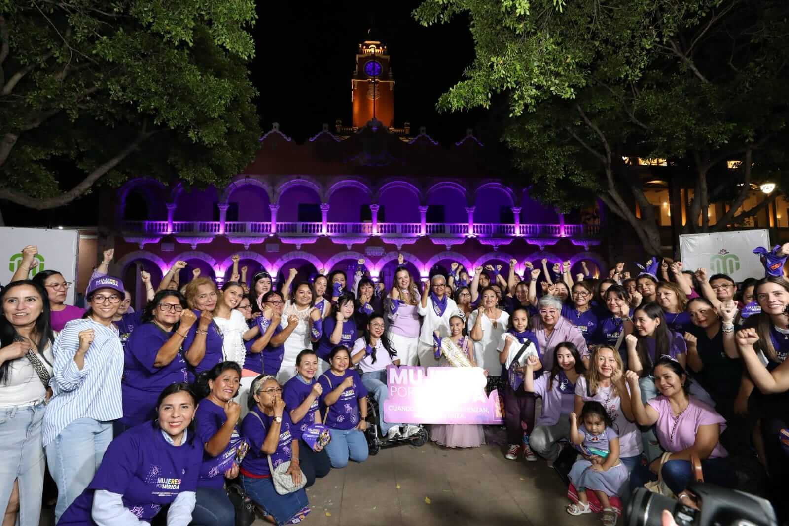 El lanzamiento de la Campaña Mujeres por Mérida se realizó frente al Palacio Municipal, donde el edificio fue iluminado con luz morada como parte de las acciones conmemorativas del Día Internacional de la Mujer.
